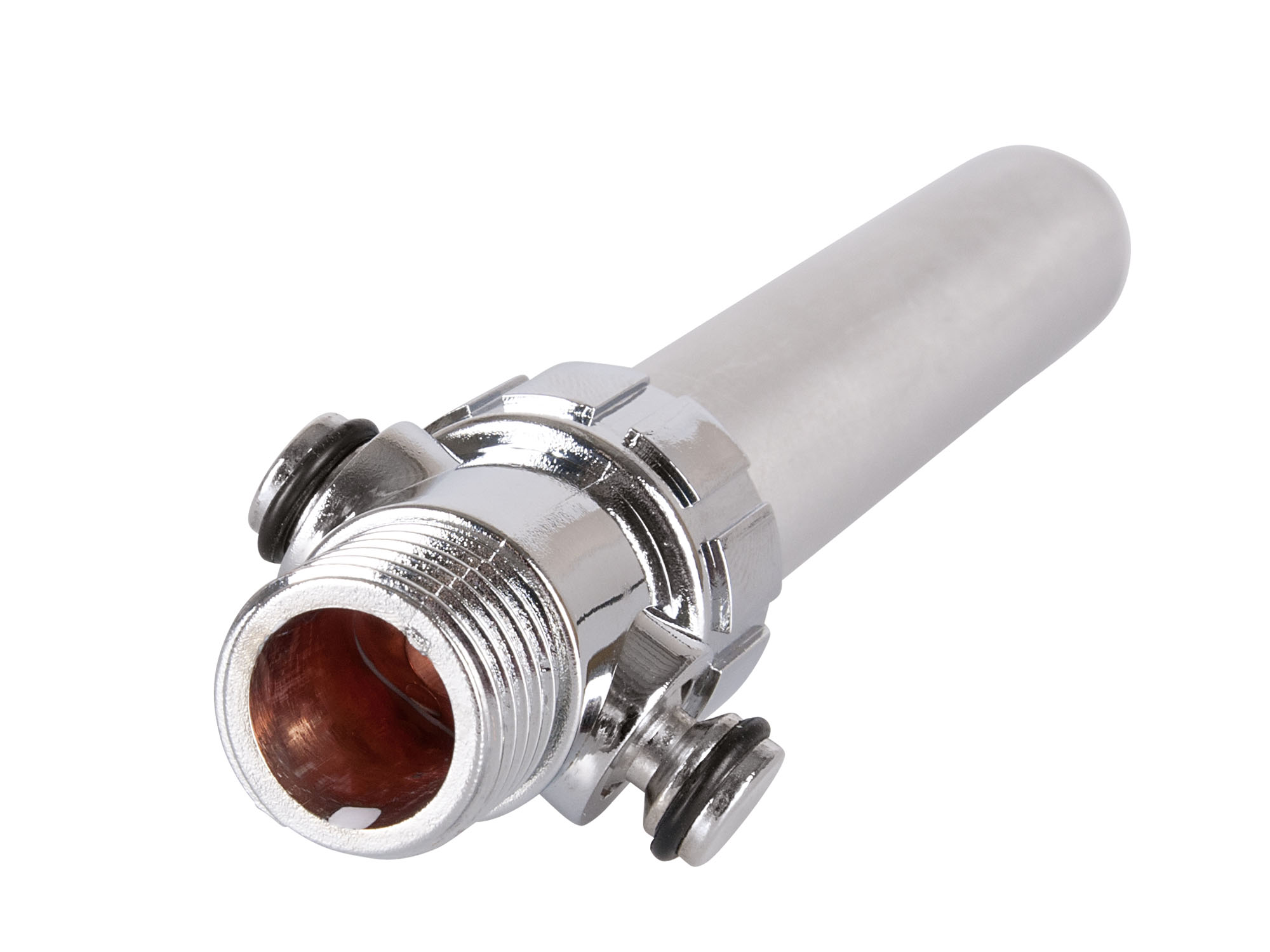 Silberfarbene Analdusche mit 5 Spritzlöchern und handelsüblichem Duschschlauchgewinde mit Stopp-Ventil, das dafür sorgt, dass zwischendurch das Wasser abgestellt und nach Wunsch wieder angestellt werden kann, ohne dass sich Temperatur und Druck des Wassers ändern. Zudem wird keine Luft nachgezogen.