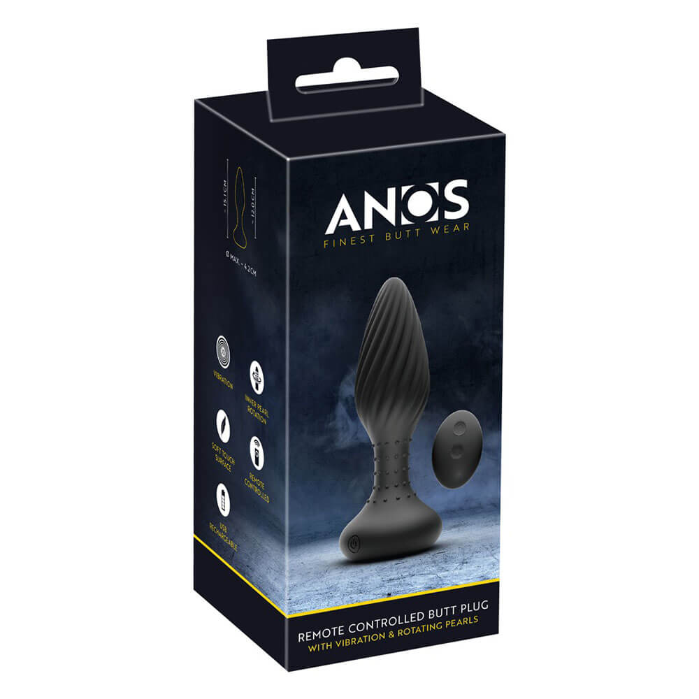 Vibro-Analplug Remote Controlled Butt Plug von ANOS im ausgeprägten Spiraldesign für eine intensive anale Massage. Dazu stimulieren rotierende Massagekugeln im unteren reizgenoppten Schaft gezielt den After. Unter dem Standfuß mit kleinem runden, goldfarbenem Spiegel, der den Anus beim Tragen des Plugs schmückt.