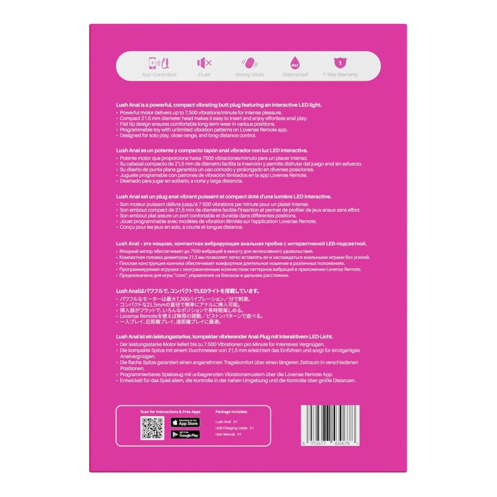 Per Bluetooth ist der Vibro-Plug Lush Anal kompatibel mit der Lovense App. Hier kann man unzählige Vibrations- und Lichtshow-Programme selber kreieren und bequem über das Smartphone steuern und speichern. Auch vom Partner oder der Partnerin über große Entfernungen. Zusätzlich kann der Lush Anal Plug seine Vibrationen per Sound aktivieren und zu Musikrhythmen synchronisieren. Die Vibrationen können auch direkt am äußeren Aufleger des Toys bequem per Knopfdruck gesteuert werden.