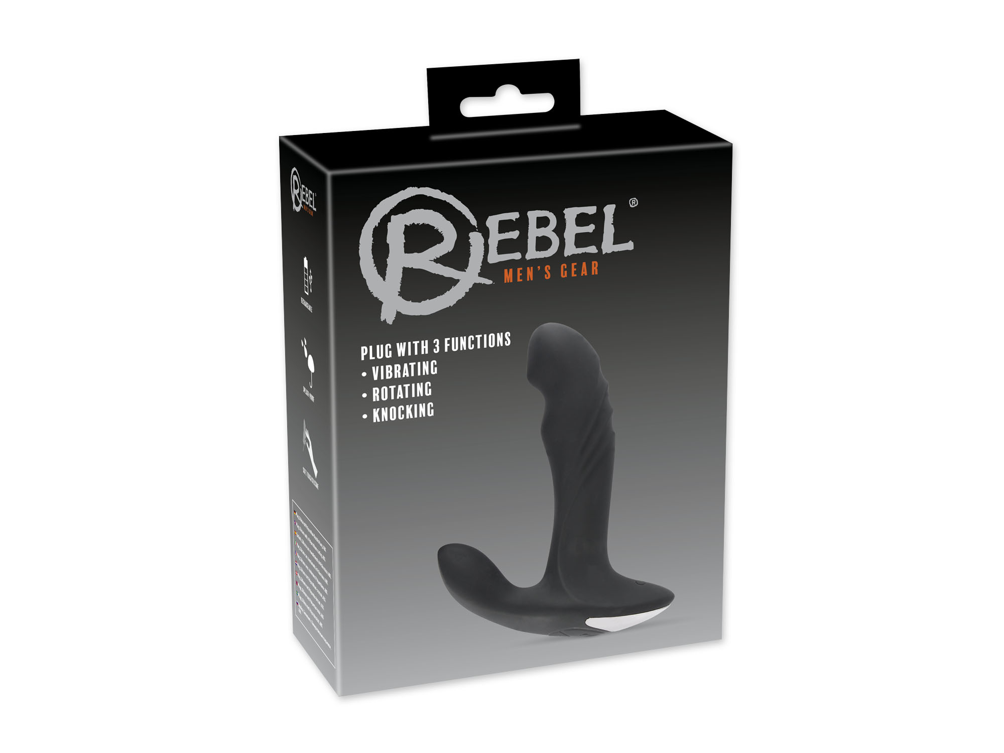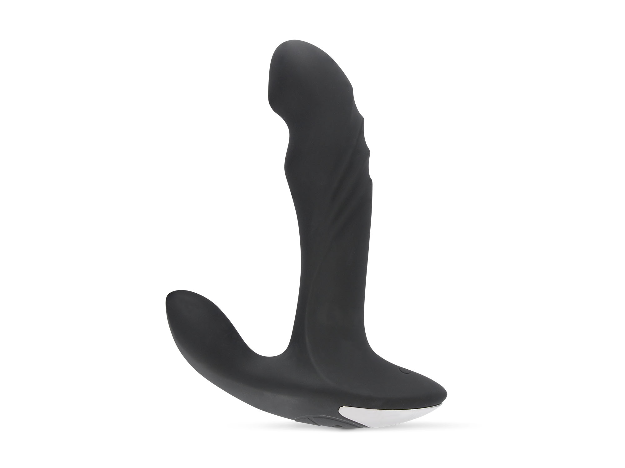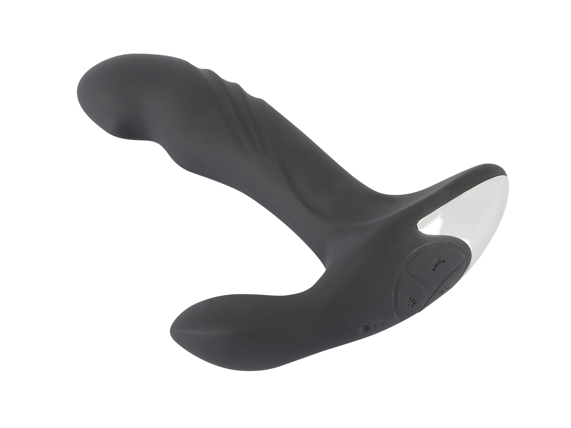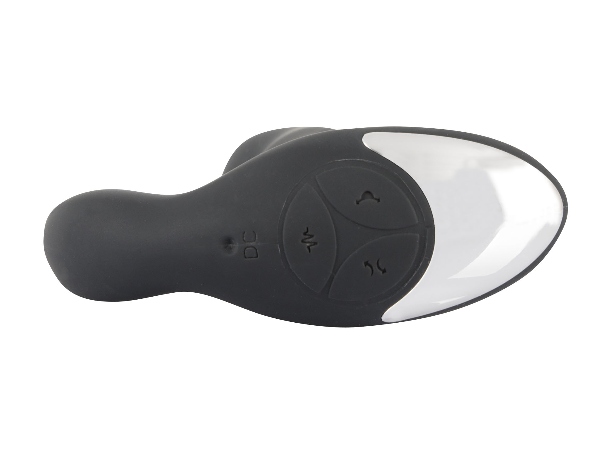 Der schwarze Analplug mit Perineumreizer, gerilltem Schaft und Verdickung unterhalb der leicht gebogenen Spitze verwöhnt gleich mit 3 prickelnden Funktionen, die alle getrennt voneinander steuerbar sind: 7 Vibrationsmodi stecken im Perineumreizer, 5 Klopfmodi in der Spitze und 5 Rotationsmodi warten im unteren Schaft.