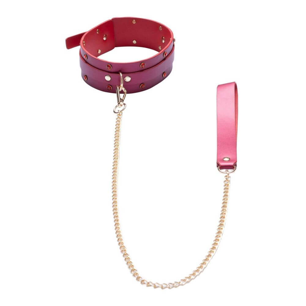 6-teiliges Bondage-Set von Bad Kitty aus feinem, pinkfarbenen Lederimitat in edler Perlglanz-Optik. Goldfarbene Beschläge und Ketten sowie funkelnde Strasssteine unterstreichen den trendigen Glamour-Look.