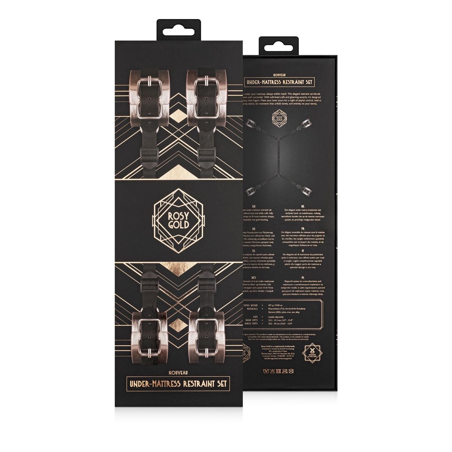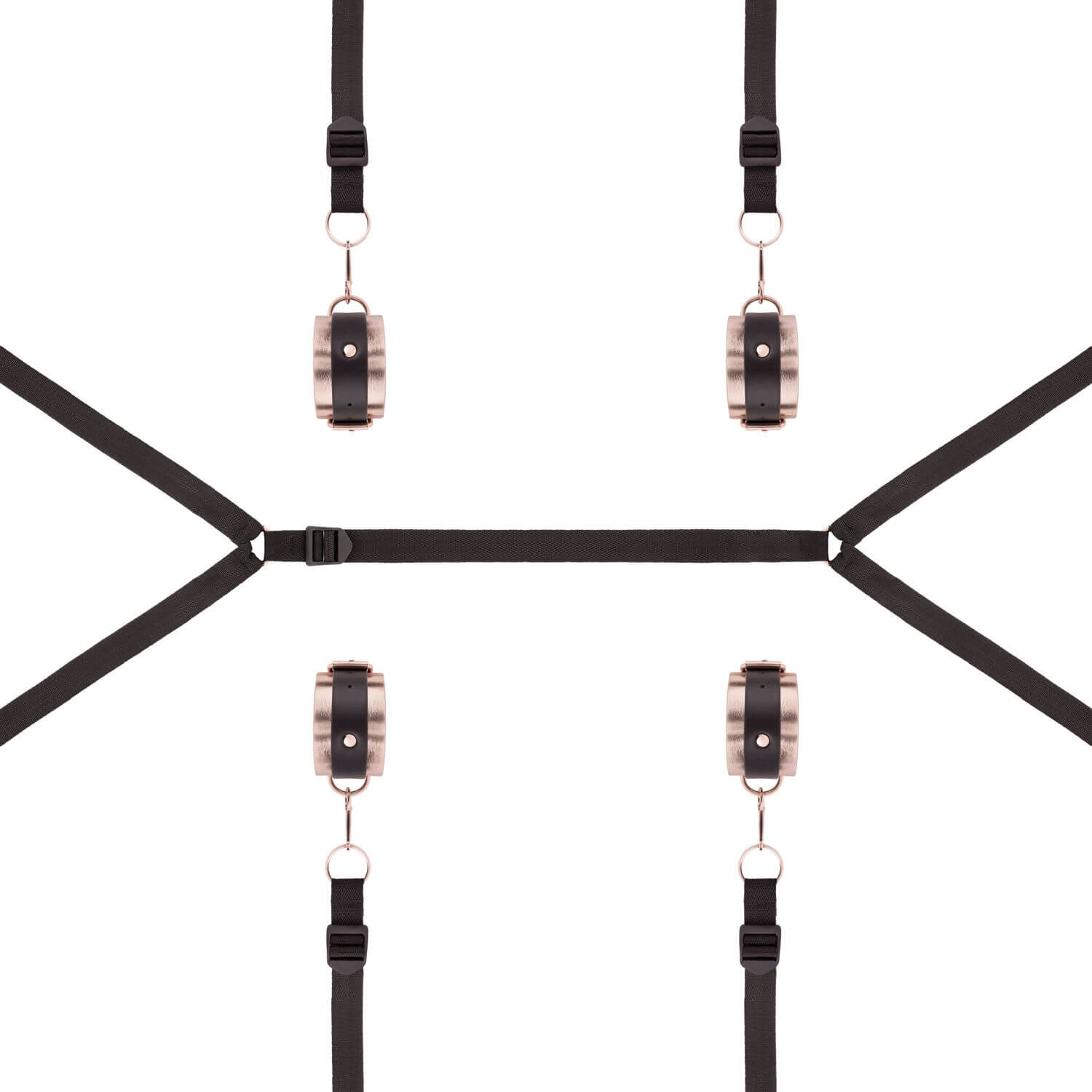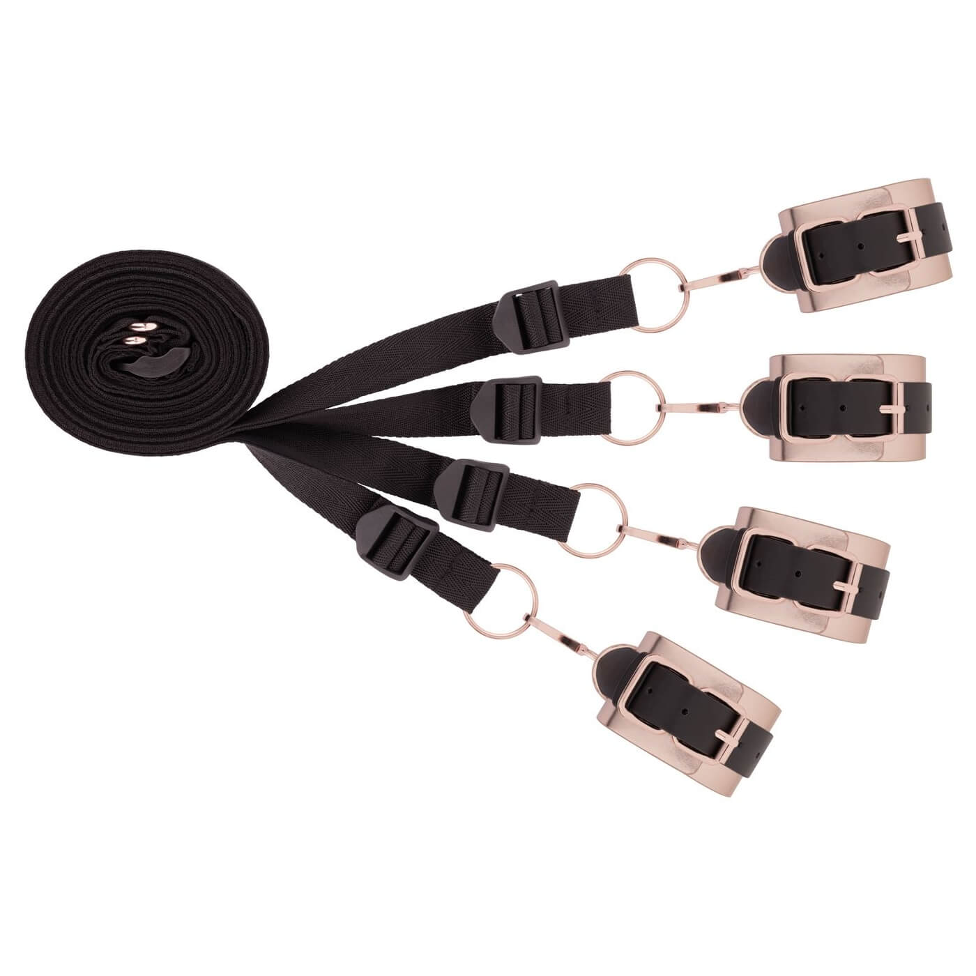 Die weich gepolsterten Manschetten mit edlem Rosé-Gold-Finish liegen angenehm auf der Haut, während die robusten, verstellbaren Bänder fest unter der Matratze verschwinden. So entsteht ein unsichtbares Netz der Lust, das jederzeit bereit ist, ohne dass das Schlafzimmer wie ein Dungeon aussieht.
