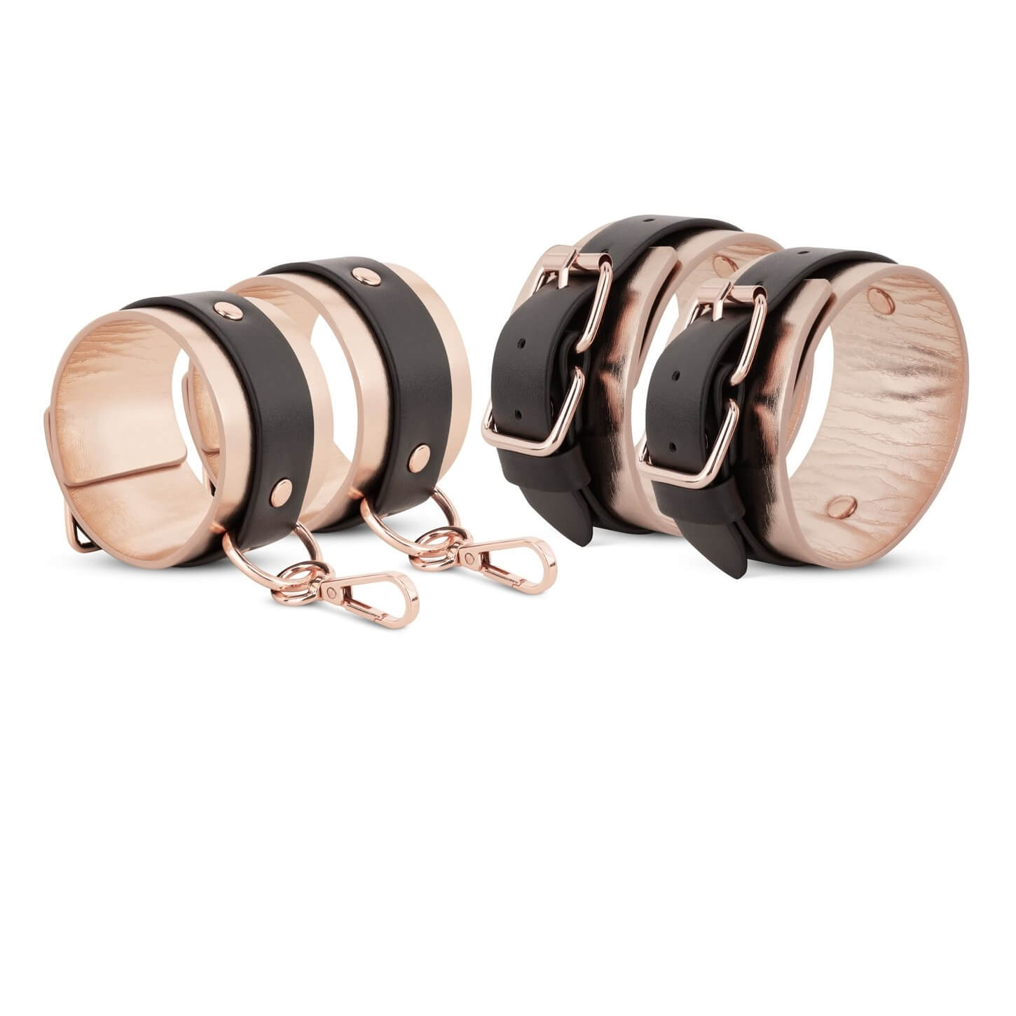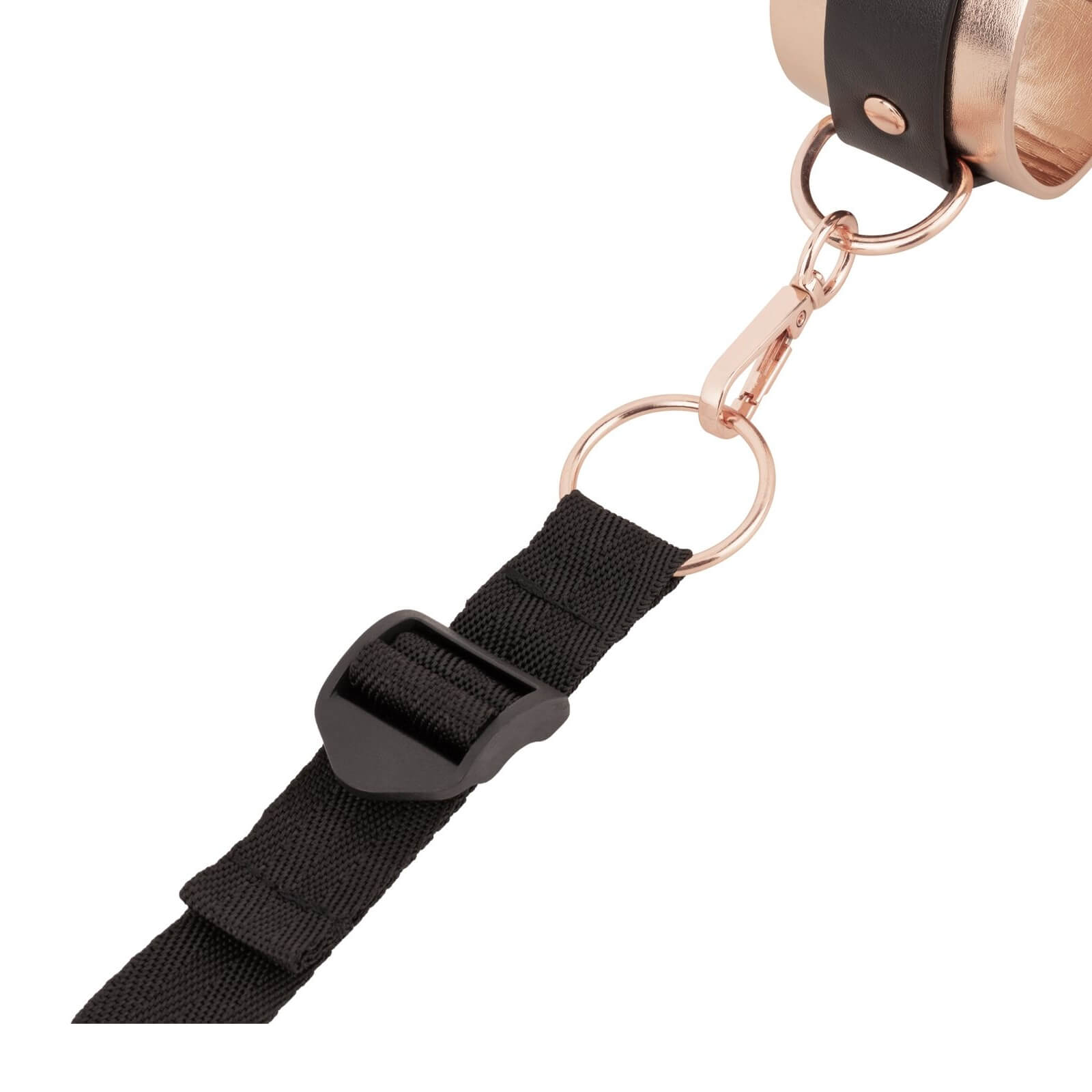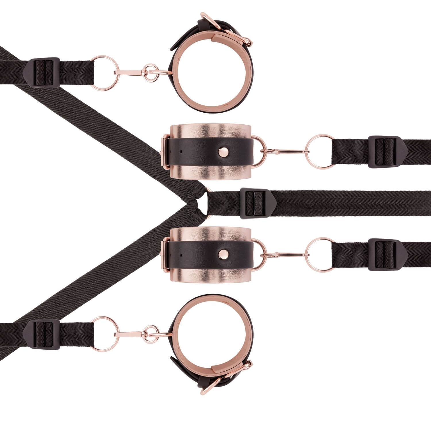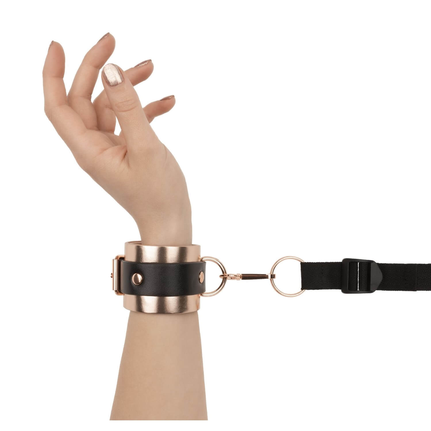 Die weich gepolsterten Manschetten mit edlem Rosé-Gold-Finish liegen angenehm auf der Haut, während die robusten, verstellbaren Bänder fest unter der Matratze verschwinden. So entsteht ein unsichtbares Netz der Lust, das jederzeit bereit ist, ohne dass das Schlafzimmer wie ein Dungeon aussieht.