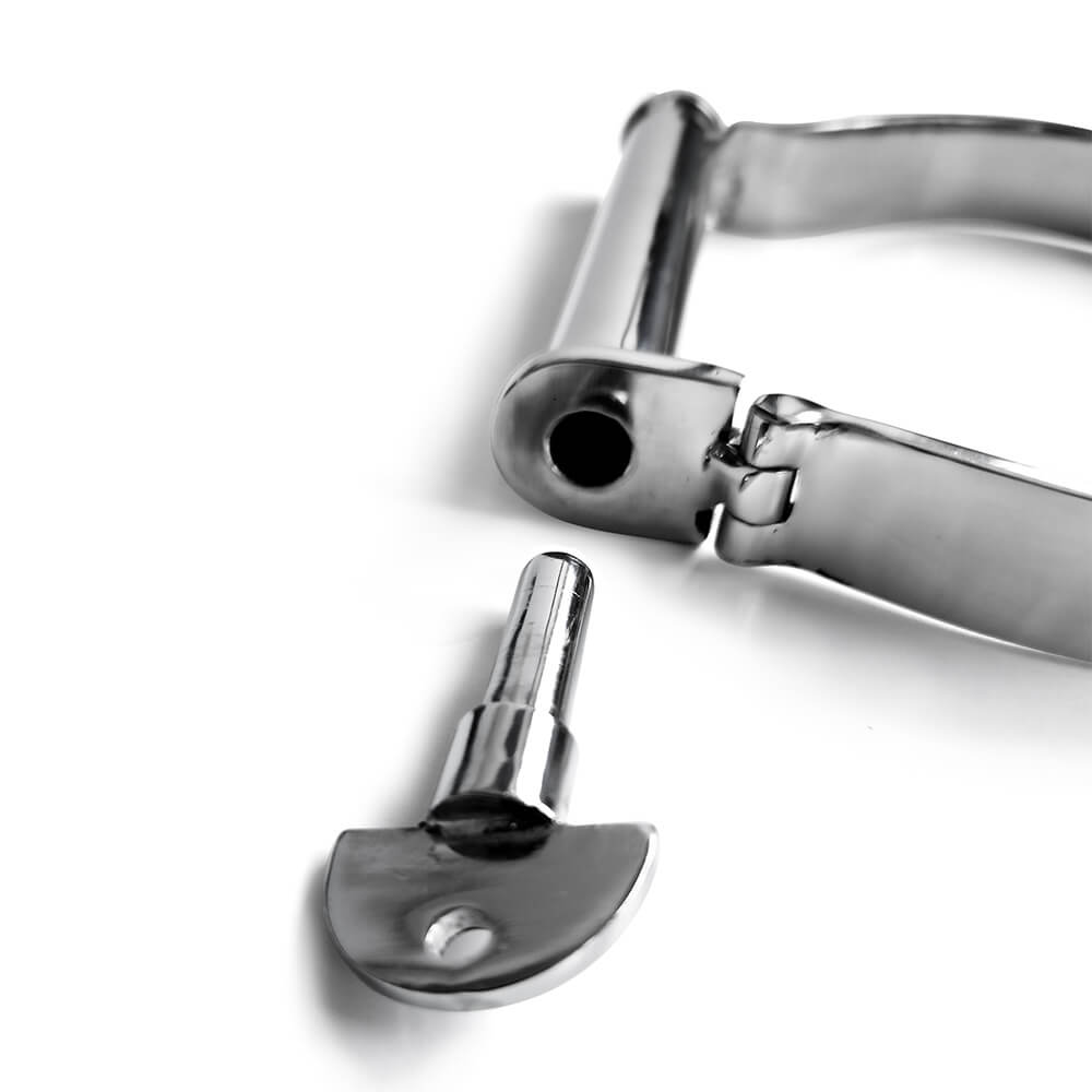 Die massive, kühle Eleganz des Edelstahls legt sich sanft um den Hals des Trägers und erinnert ihn bei jeder Bewegung an seine Rolle. Das traditionelle Darby-Design mit der geraden Verriegelungsstange unterstreicht die Unausweichlichkeit seiner Unterwerfung, einmal geschlossen, kann nur der Dominus ihn wieder öffnen. Ein einziger Schlüssel symbolisiert die alleinige Kontrolle des Besitzers, während der O-Ring an der Vorderseite bereitsteht, um Leine, Seil oder andere Zeichen der Führung zu empfangen.