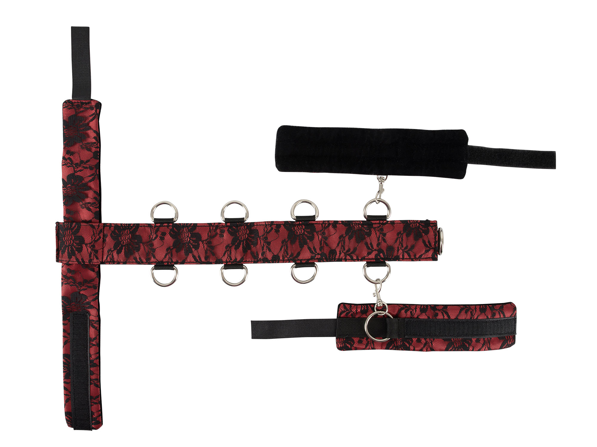 Halsfessel mit beringtem Steg und Handfessel-Set mit Karabinerhaken. Aus sinnlich rotem Satin und schwarzer Spitze. Auf der Innenseite aus edlem schwarzem Samt. Mit individuell einstellbaren Klettverschlüssen.