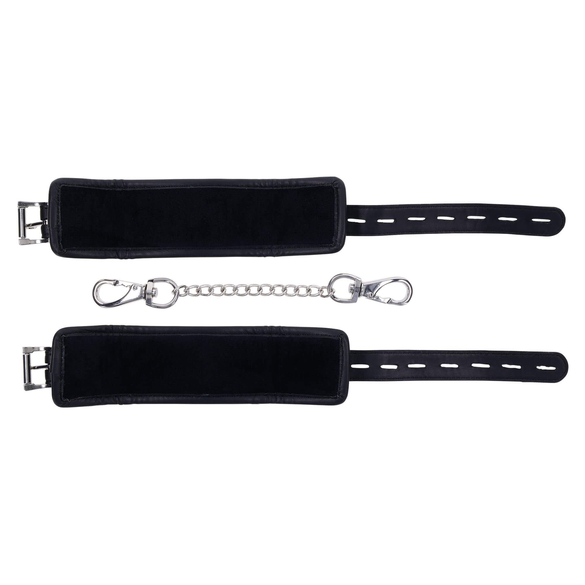 Diese passenden schwarzen Handschellen sind gepolstert für Komfort und Strapazierfähigkeit, entwickelt für langes Tragen und sichere Fesselung. Mit ihren eleganten silbernen Metallbeschlägen und verstärkten Nähten halten sie selbst den intensivsten Sessions stand.