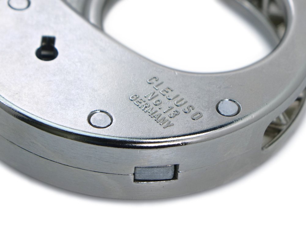 Mit der Schnellverriegelung werden die Handschellen arretiert. Die Arretierung befindet sich an der Seite der Handschellen und kann einfach mit den Fingern eingedrückt werden. So werden die Handfesseln arretiert und können nicht mehr enger um das Handgelenk gedrückt werden. Zum Aufschließen und öffnen braucht man den Schlüssel nur in eine Richtung zu drehen. Erst löst sich die Arretierung, dann öffnet sich die die Schelle.