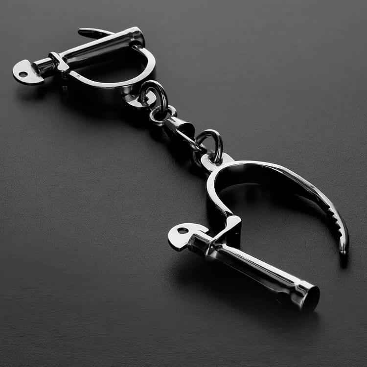 Gefertigt aus massivem Edelstahl, überzeugen diese Handschellen durch ihr angenehmes Gewicht und ihre glatte, runde Form, die einen komfortablen Sitz ermöglicht. Die raffinierte Schraubverriegelung mit dem mitgelieferten Schlüssel garantiert festen Halt, während das bewegliche Scharnier für die nötige Flexibilität sorgt, perfekt für langanhaltendes, aufregendes Spiel.