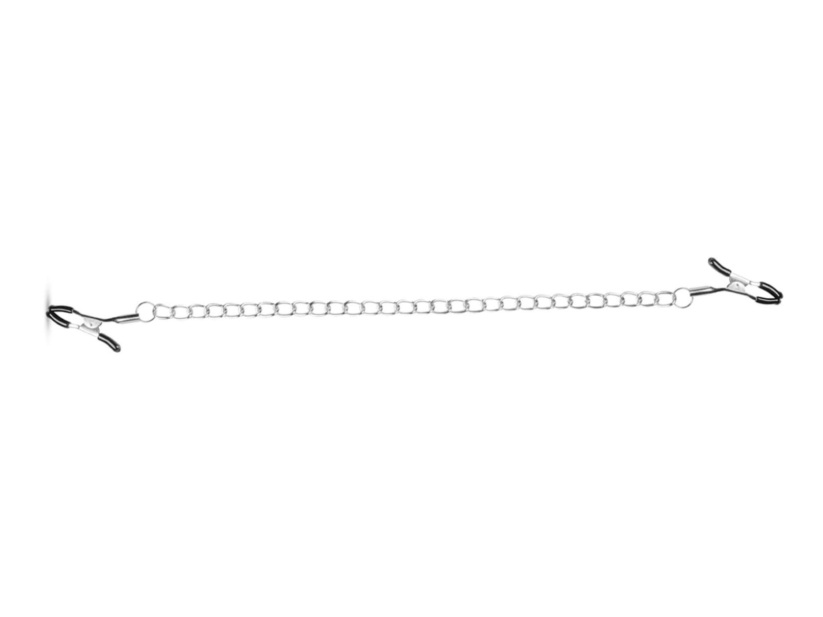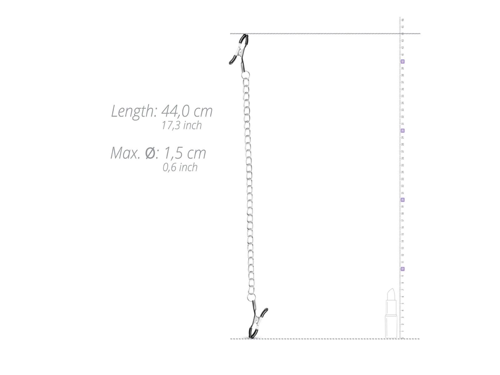An den Nippelklemmen ist eine lange Metallkette befestigt. Spüren Sie, wie die Klammern fest an Ihr Brustwarzen zusammenkneifen, während das kalte Metall Ihren Körper berührt und erregt. Sind Sie bereit für eine aufregende neue Erfahrung?