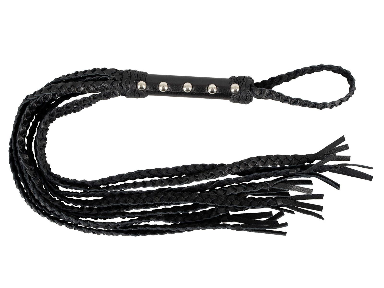Peitsche mit neun Riemen aus geflochtenem Leder für dominant/devote Spiele der etwas härteren Art. Die hochwertige Peitsche ist komplett aus weichem Leder gefertigt und liegt mit ihrem nietenbesetztem Griff gut und ausgewogen in der Hand. Am Griffende mit Halte-/Aufhängeschlaufe.