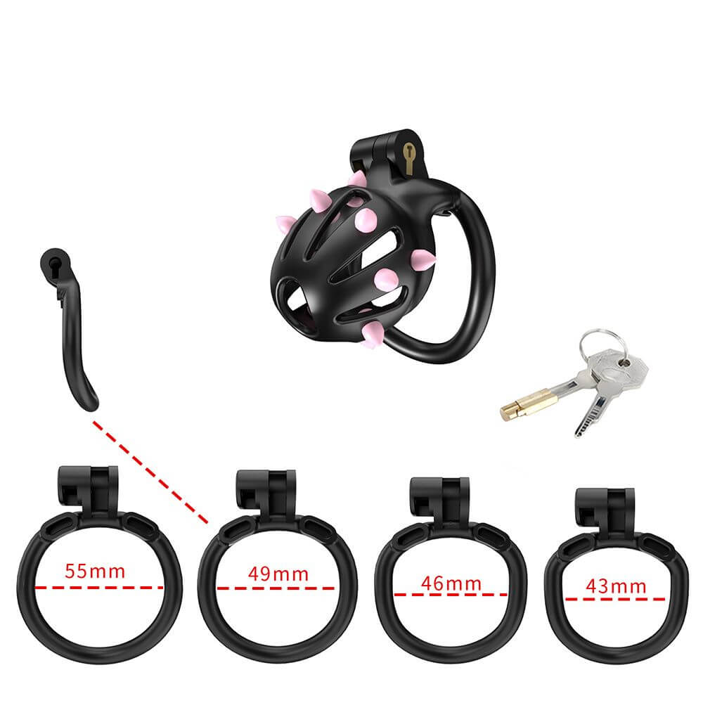 Der Cellmate FlexiSpike geht über klassische Keuschhaltung hinaus. Dank der vier beiliegenden Silikon-Spike-Sets in Schwarz & Pink kann der Dominante individuell bestimmen, wie intensiv die Kontrolle ausfallen soll: