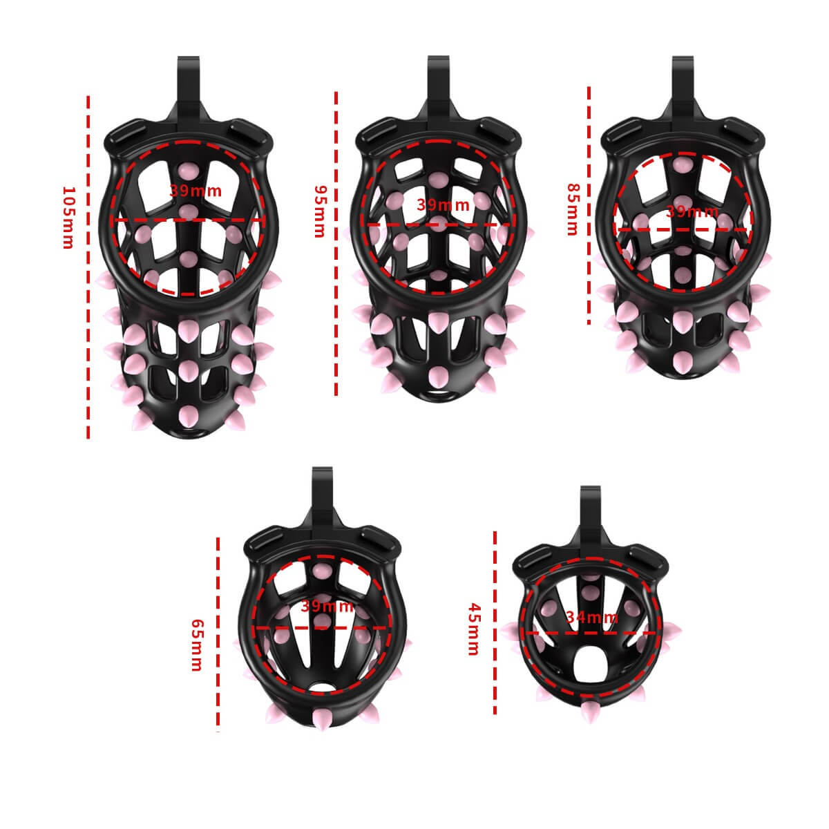 🔹 Maximale Einschränkung: Mit der abgerundeten Seite der Spikes nach innen wird der Innenraum des Käfigs verengt, sodass der Penis weniger Platz hat, eine konstante Erinnerung an die völlige Kontrolle.