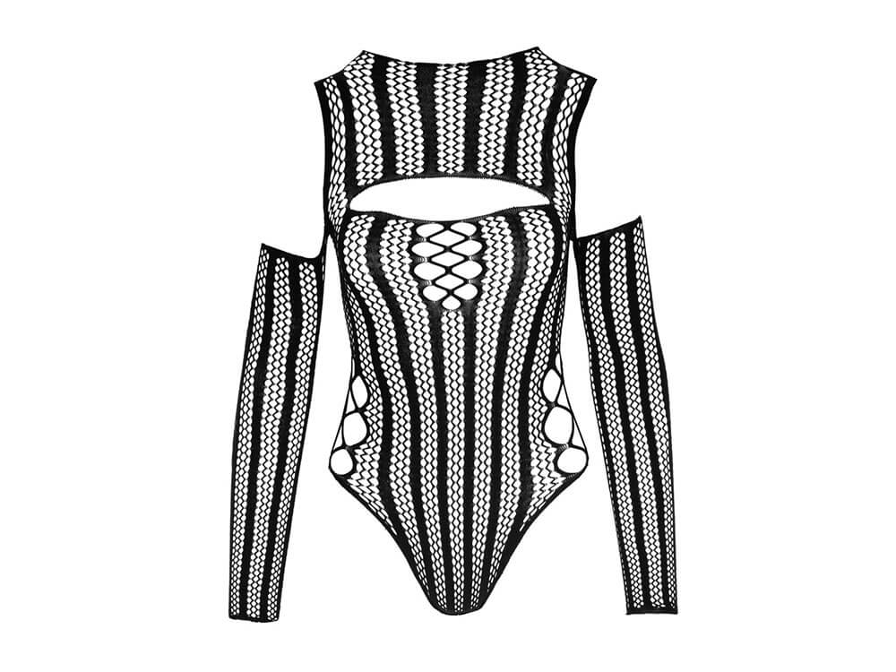 Aufregend schulterfrei, am Dekolleté und im Rücken mit Cut-out und Grobnetz. Jeweils seitlich ebenfalls Grobnetz. Im Schritt mit erotisch-praktischem Druckknopfverschluss.
