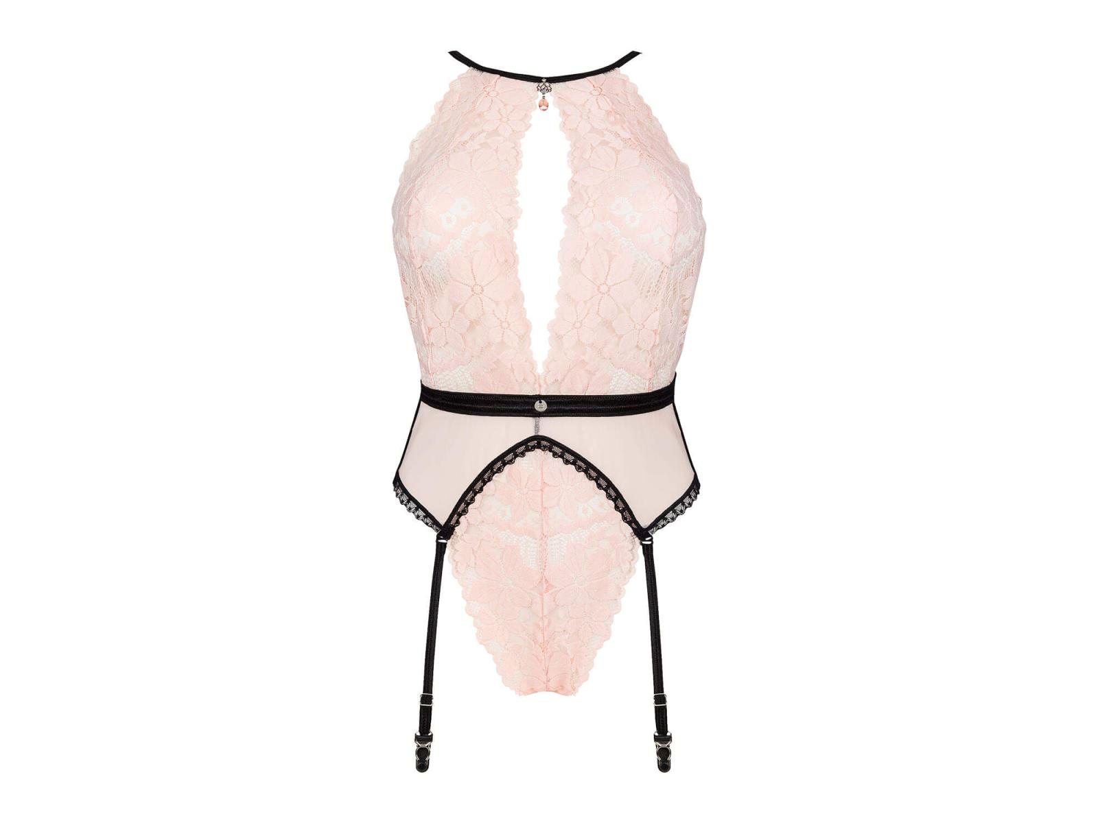 Stringbody Lilines von Obsessive aus roséfarbener weicher Spitze mit eingearbeitetem Strapsgurt aus zartem Powernet.