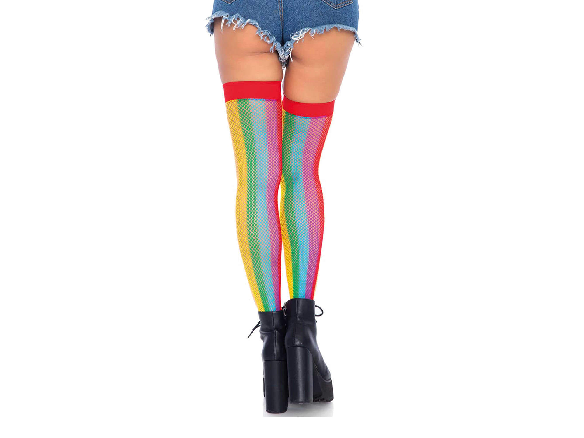 Leg Avenue Netzstrümpfe in Regenbogenfarbe mit roten Bund