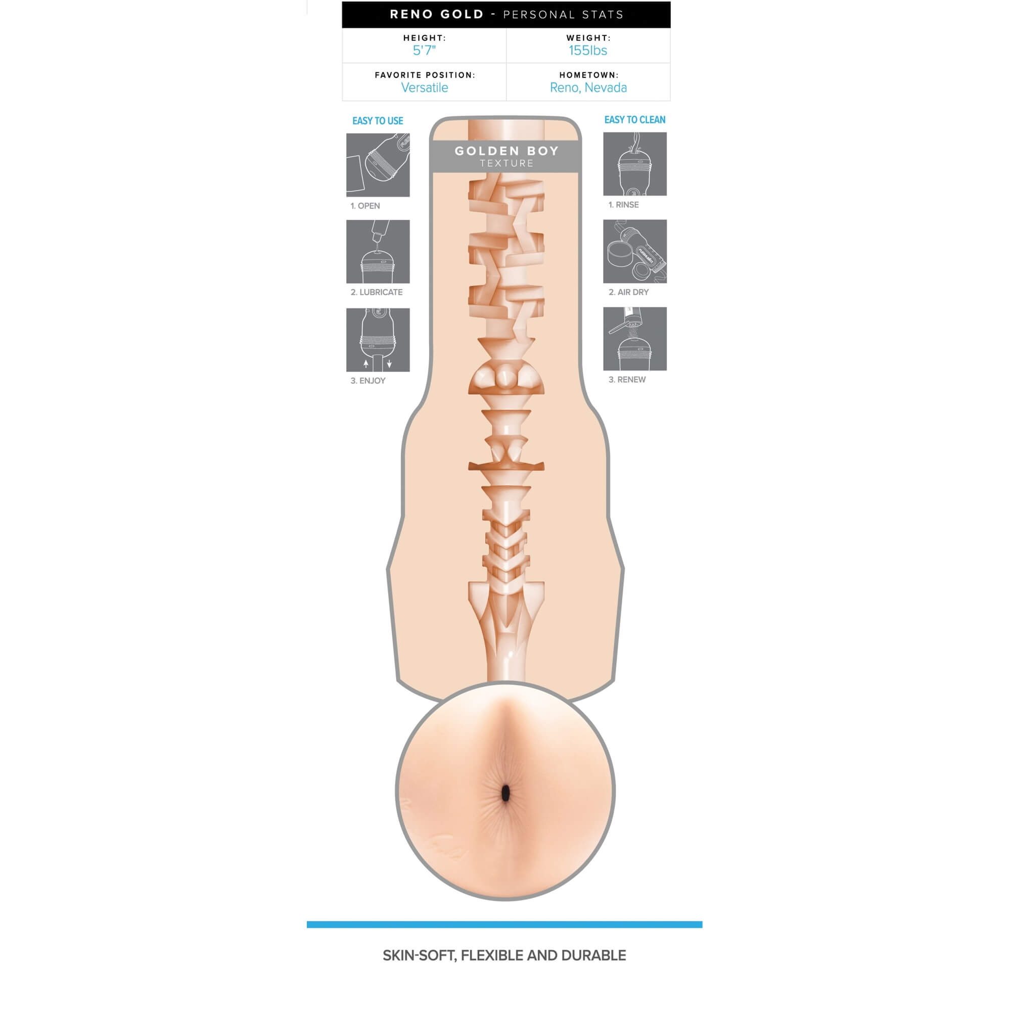 Erlebe die intensive Lust eines der heißesten Pornostars der Szene, mit dem Fleshjack Reno Gold aus der begehrten Fleshjack Boys-Kollektion. Dieser hochwertige Masturbator mit Anusöffnung wurde nach dem Körper von Reno Gold modelliert und bietet dir ein einzigartiges Solo-Erlebnis mit maximalem Realismus.