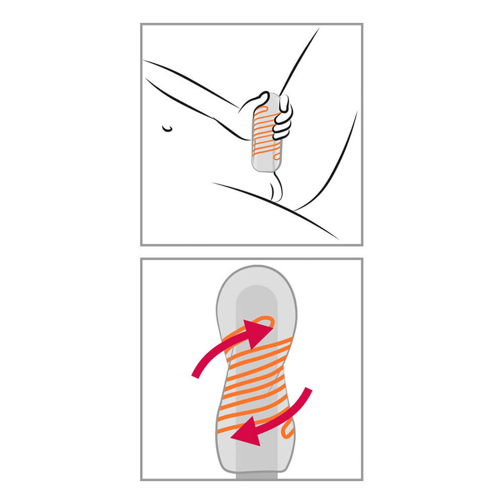 Transparenter, wiederverwendbarer Masturbator Spinner von TENGA mit integrierter Spule, die bei Penetration den Masturbator ins Drehen versetzt (Internal Coil Mechanism). Ausgeprägt reizstrukturierter Lustkanal mit sechseckigen Kacheln mit geraden Kanten.