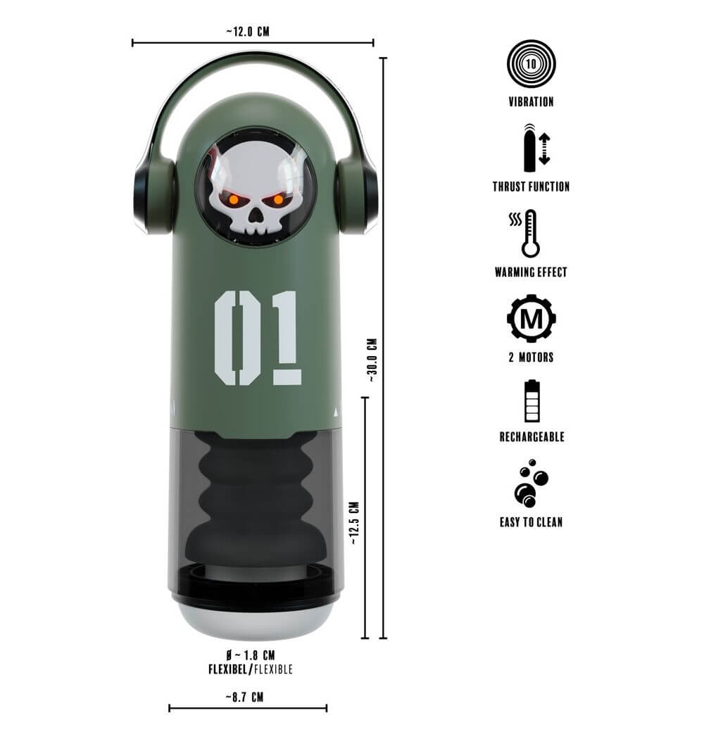 Mit den coolen Headphone-Buttons ist die Vibration in 10 Modi und die Stoßmassage in 5 Modi bequem steuerbar. Die Wärmefunktion sorgt für wohlige 42°C (max.). In der ultraweichen Sleeve wird der Penis zusätzlich von Noppen und Rillen intensiv massiert. Die Sleeve in neutraler Optik wird magnetisch im Gehäuse gehalten und ist zur einfachen Reinigung leicht herausnehmbar. Mit seiner Schutzkappe wird der stylische Masturbator staubsicher und diskret verwahrt.