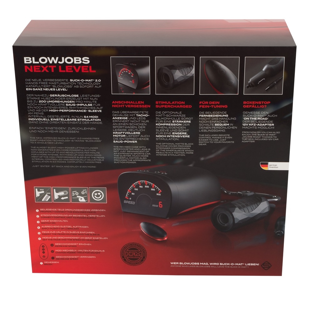 Der Suck-O-Mat 2.0 ist nicht einfach ein Gerät, er ist ein Erlebnis. Sein sportlich-elegantes Gehäuse mit LED-Tacho-Anzeige erinnert an das Cockpit eines Sportwagens und bringt visuelle Spannung ins Spiel. Mit der Fernbedienung steuerst du bequem Geschwindigkeit und Modi, während du dich ganz deinen Gefühlen hingibst.
