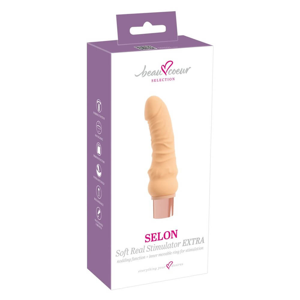 Der energiegeladene SELON Soft Real Stimulator EXTRA von beau cœur kommt mit seinem realistisch strukturierten Design einem echten Penis täuschend nah – und fühlt sich auch genauso streichelweich und seidig an! Bequem per Knopfdruck startet der SELON dann seine kraftvolle Action mit prickelnder Vibration, intensiv nickender Eichel und sich auf und ab bewegendem Move-Massagering. Das komplette Vagina-Verwöhnprogramm! Einfach einführen und genießen …