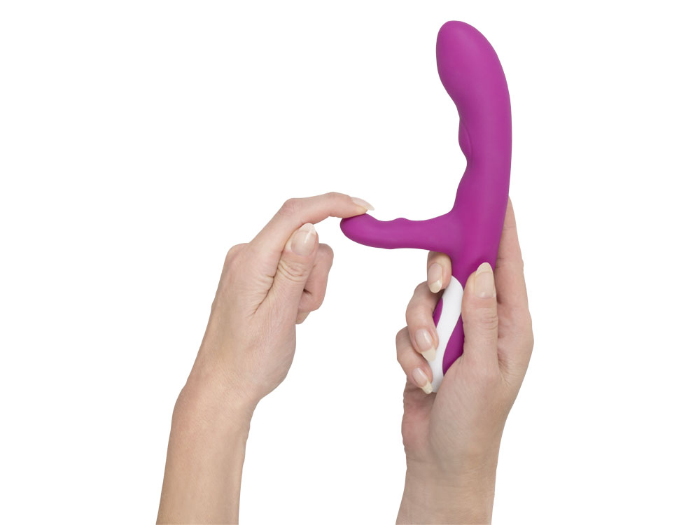 Ein Motor befindet sich im Schaft, der andere im Reizarm, beide verfügen über 5 Vibrationsmodi, getrennt steuerbar per Knopfdruck. Aber das besondere Highlight ist die Wärmefunktion in der Schaftspitze: Sobald der Vibrator eingeschaltet ist, heizt sich die Spitze auf angenehme 42 °C auf.