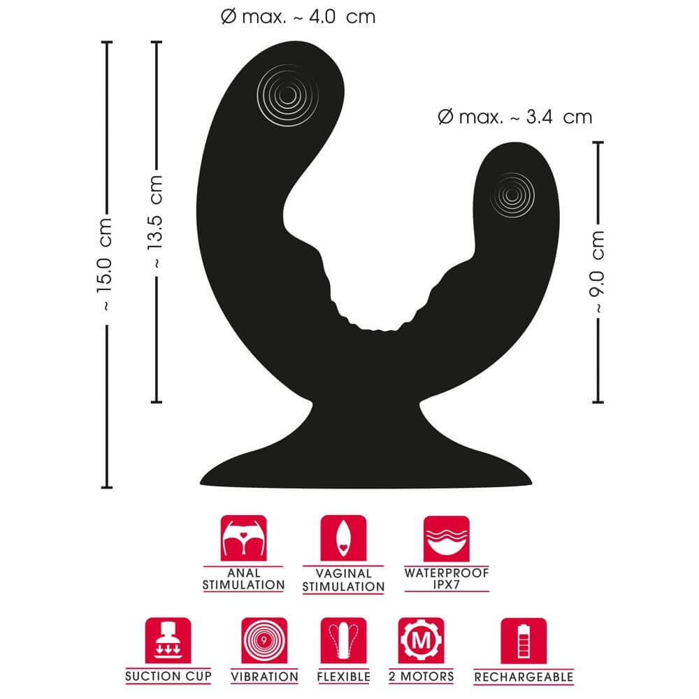 Der dynamische Dual Vibrator von Sweet Smile kombiniert einen größeren und einen kleineren Vibrator in einem geschwungenen Toy. Ausgestattet mit einem starken Saugfuß, lässt sich der Doppelvibrator fest und sicher auf glatten Oberflächen fixieren, um ihn freihändig zu genießen: Sanftes Schaukeln, intensives Reiben, tiefgehendes Vergnügen!