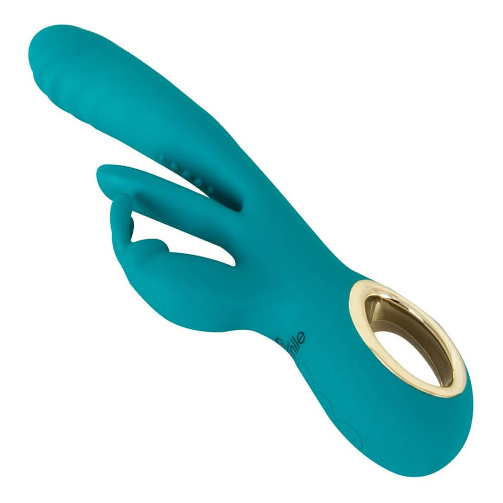 Starker Triple Vibe With Flicking Tongue von Sweet Smile für dreifache Action: Vagina, Klitoris und die Analregion werden zugleich verwöhnt! Für klopfende Impulse in der Vagina sorgt die hin und her schwingende softe Noppen-Zunge, die sich im Schaft verbirgt (Flicking Tongue). Dazu bieten die Vibrationen im Kopf und den beiden Stimulatoren zusätzliche intensive Stimulationen. Ist der 3-armige Vibrator komplett eingeführt, verwöhnt er sogar freihändig – einfach zurücklehnen und genießen!